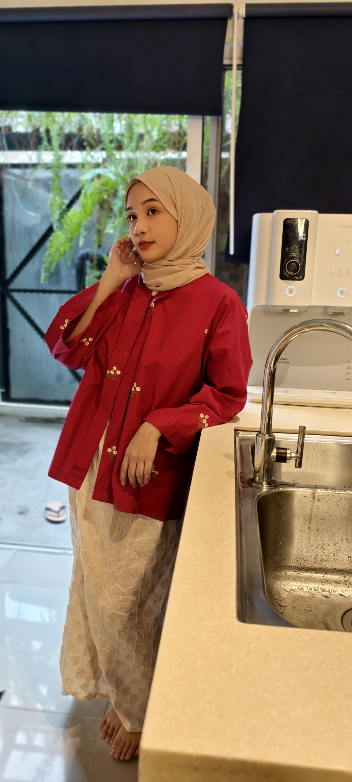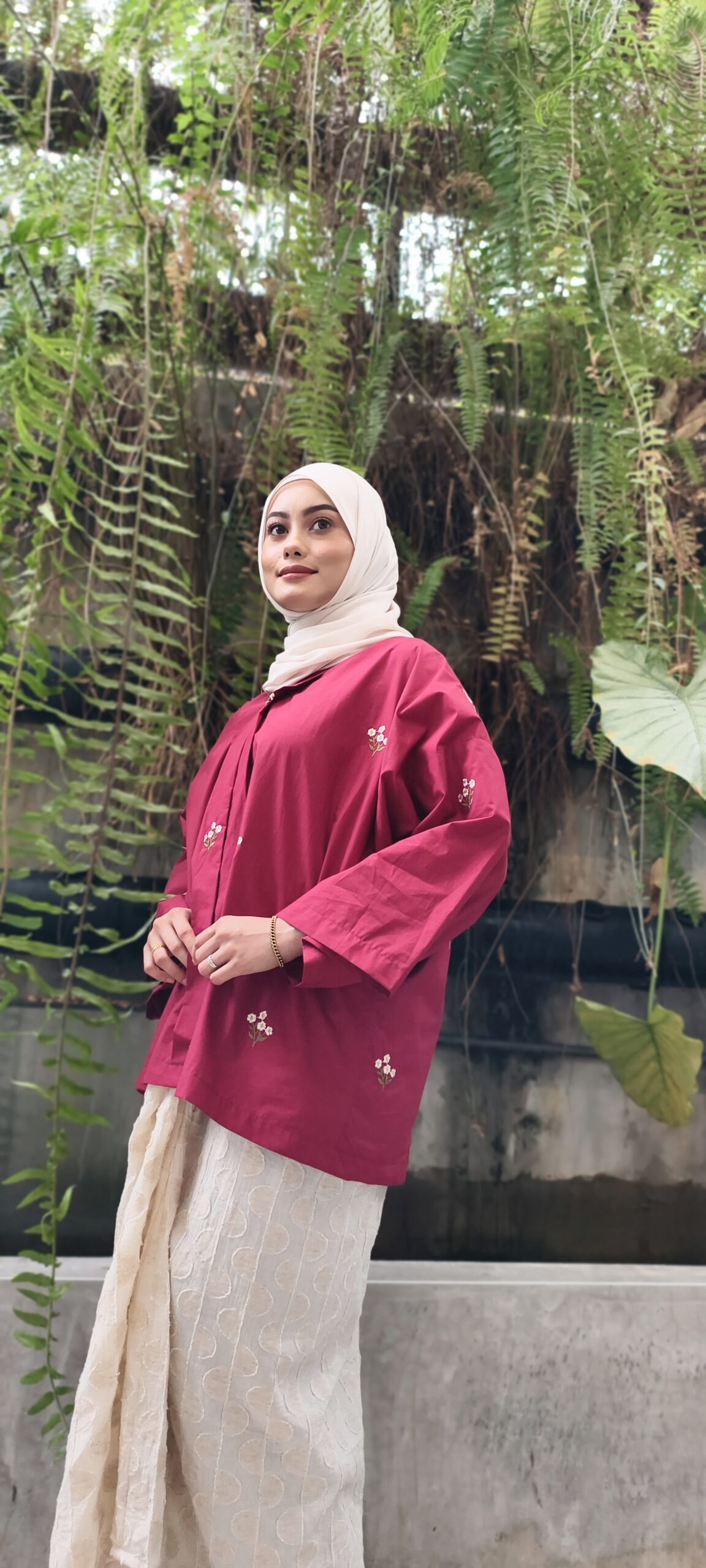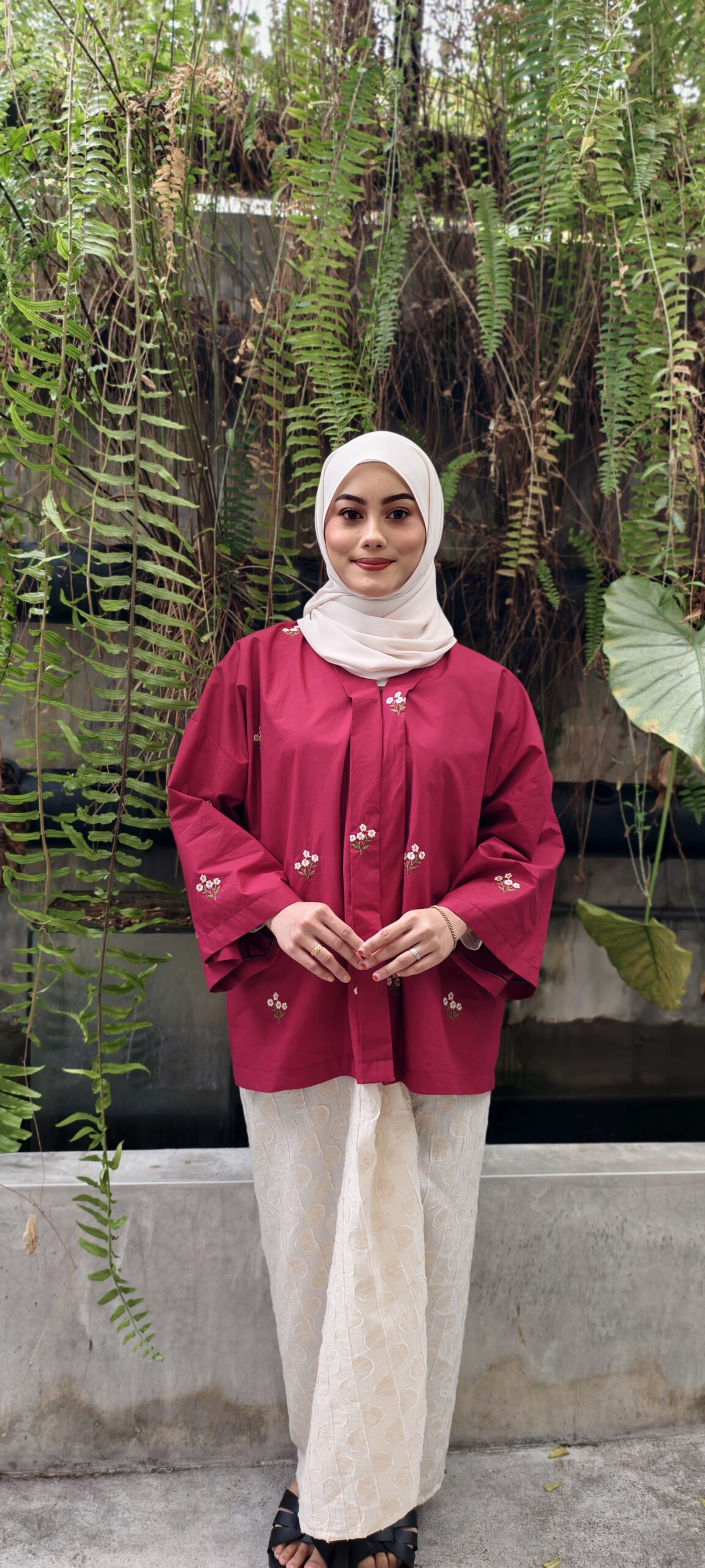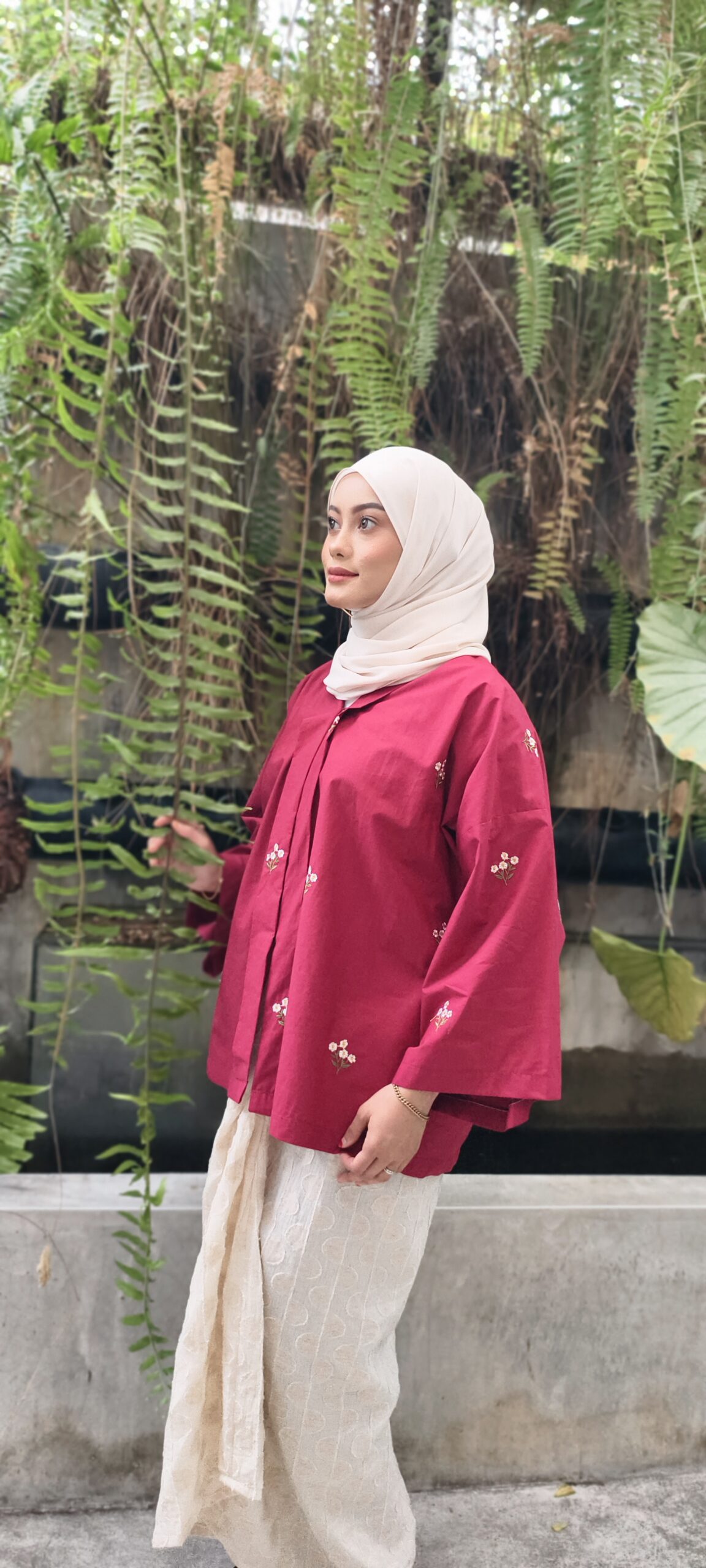 Detik Senja carries a sense of depth and quiet confidence. This  100% embroidered cotton kebaya kelepet is tailored to flatter while remaining relaxed, paired with a polka organic cotton linen kain sarung that offers structure with breathability. The rich maroon tone evokes timeless Raya elegance, classic, composed, and enduring.