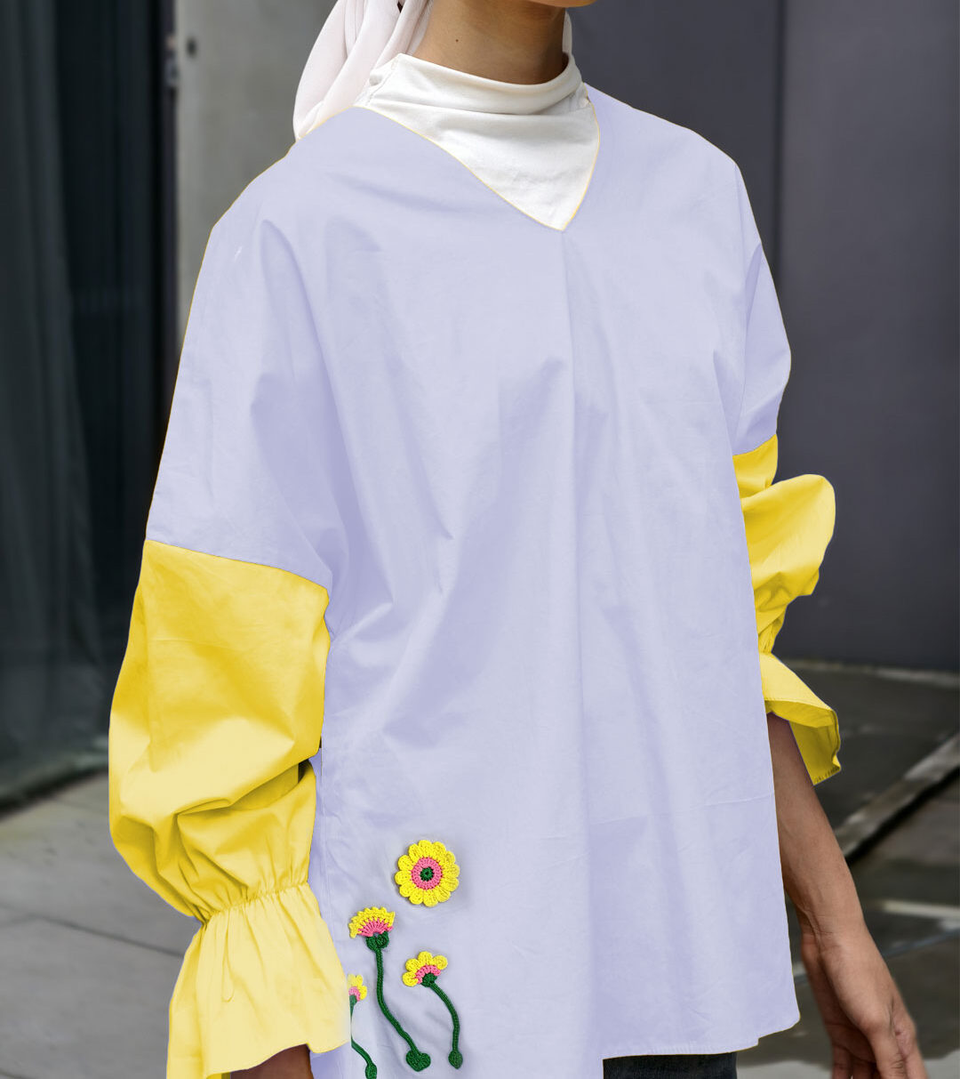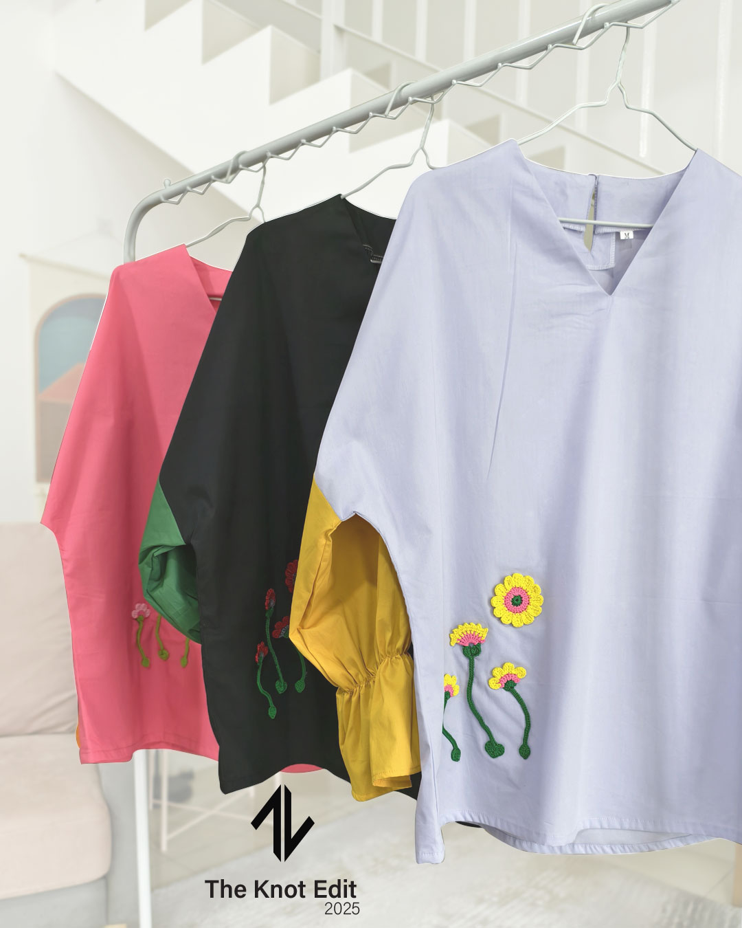 A fresh take on everyday wear, this top blends comfort with artistry. Featuring vibrant color-blocked sleeves and hand-sewn crochet florals, it’s designed to stand out effortlessly. The loose silhouette makes it easy to style while keeping you relaxed all day.